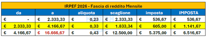 Quindi, la nuova struttura dell’Irpef sarà sempre a tre scaglioni, ma con un’aliquota differente nel secondo: il 23% fino a 28.000 euro, il 33% da 28.000 a 50.000 euro e il 43% oltre questa soglia.