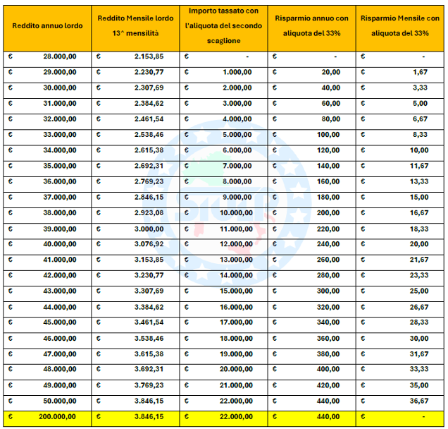 In sostanza, nulla cambia per chi ha redditi bassi, mentre per chi si colloca nella fascia intermedia scatta uno “sconto” di 2 punti, che si traduce in un risparmio proporzionale alla parte di reddito compresa in quello scaglione. Su un reddito lordo di 30.000 euro, ad esempio, il vantaggio fiscale è di circa 40 euro l’anno, corrispondenti al 2% sui 2.000 euro che eccedono la soglia dei 28.000. Con 35.000 euro il risparmio sale a 140 euro, con 40.000 a 240, con 45.000 a 340, fino a un massimo di 440 euro per chi guadagna 50.000 euro o più.